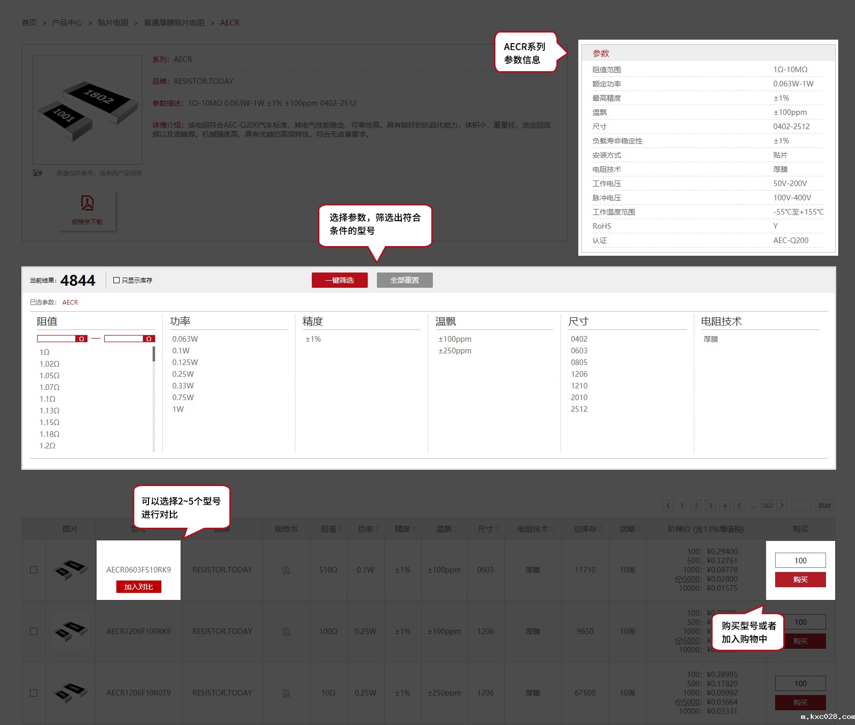- 例如搜索“AECR”,点击回车或者放大镜进行搜索。页面跳转至相关系列详情页。用户可以在该页面查看该系列的详细信息,也可通过简易快速选型工具对参数进行进一步选择,筛选出符合的型号。还可以购买和比较不同型号的商品。