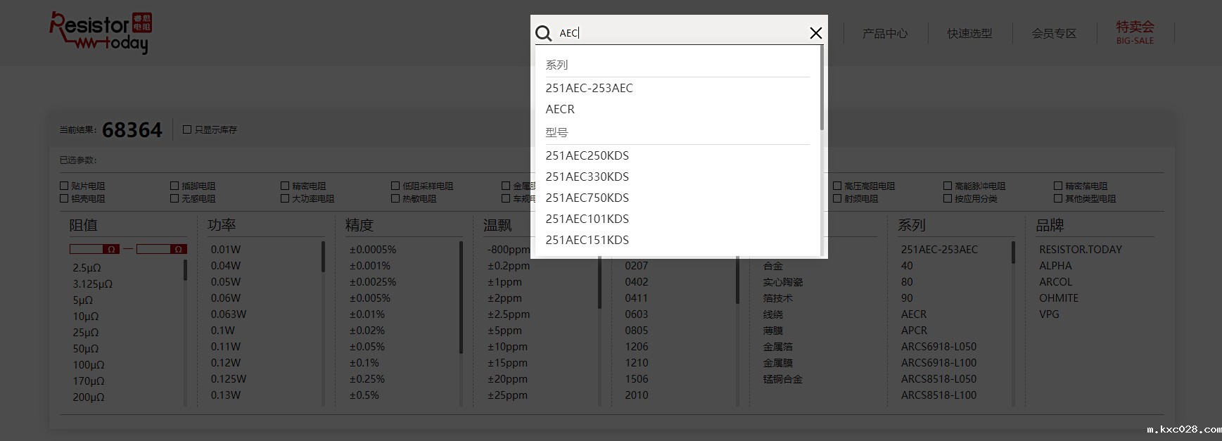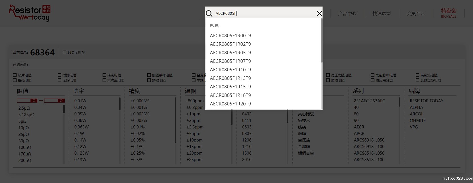 - 例如搜索“AECR0805F”,搜索下拉框出现与“AECR0805F”相匹配的型号。用户可在下拉列表中选择型号,直接跳转到相关的型号详情页。