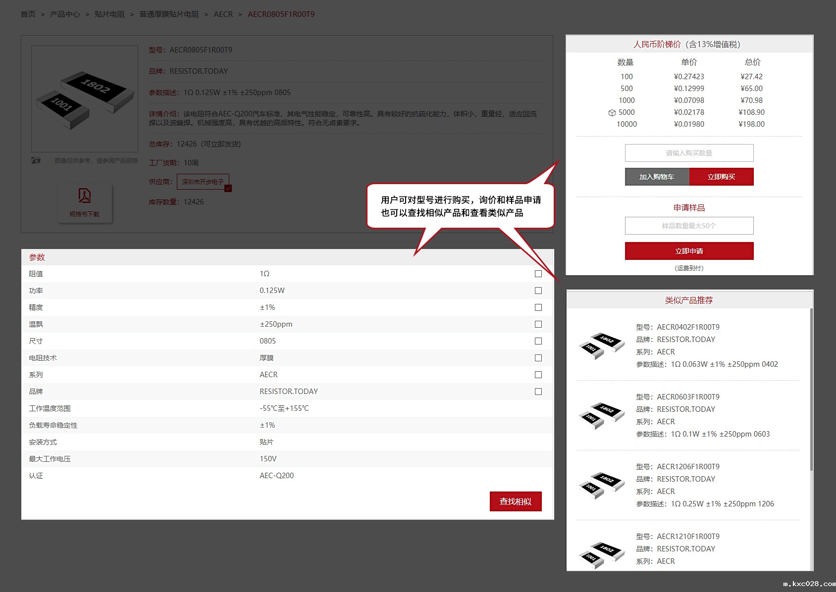 - 例如搜索型号“AECR0805F1R00T9”,点击回车或者放大镜进行搜索。页面跳转至相关型号详情页,用户可以在此页面进行商品询价与购买、样品申请、查找相似产品和查看类似产品推荐等功能。