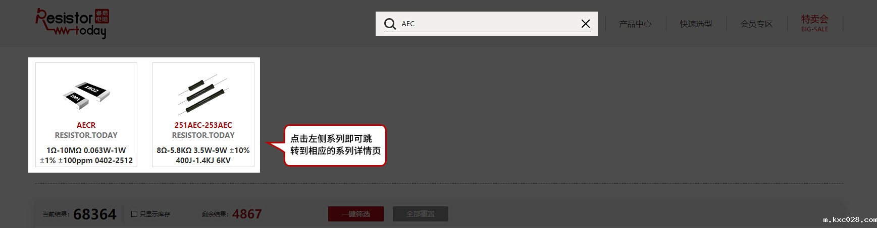- 例如搜索“AEC”,搜索下拉框出现与“AEC”相关的系列。用户可在下拉列表中选择系列,也可以点击放大镜进行搜索。